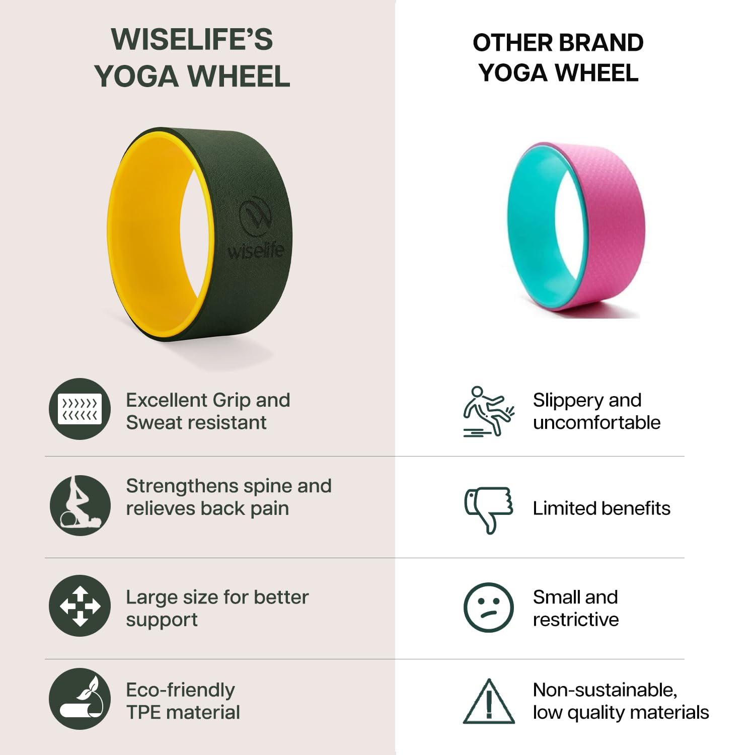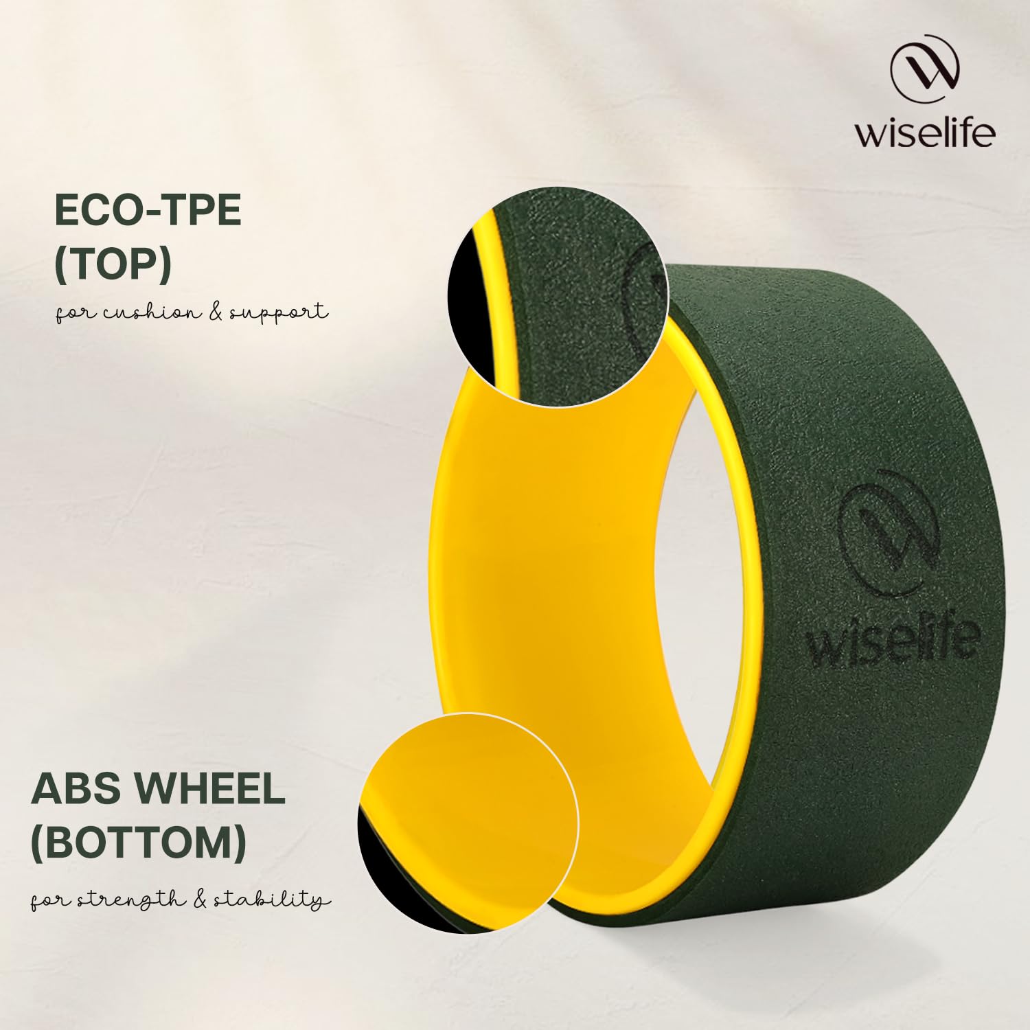 <p><strong>About this item</strong></p><ul><li>SIMPLE AND EFFECTIVE LASTING BACK PAIN RELIEF: Wiselife yoga back wheel is designed for everyday people who suffer from chronic back pain. Use it to help relieve myofascial pain and muscle tension along the spine in your upper back, lower back and neck.</li><li>IMPROVE YOGA POSTURES - Wiselife offfers best back bend and stretching equipment you could have, our yoga wheel will open you for whole new range of exercises.</li><li>SUPERIOR CONSTRUCTION: Yoga Wheel is made of high-quality, durable material. It's sturdy, safe, and comfortable.</li><li>SIZE: 12.75x5.75 inch is the perfect size for back support, stability in balance poses, and easy carrying.</li><li>SWEAT RESISTANT: Thanks to its superior padding, which gives moisture free accumulation, the texture makes it slip resistance and also does not retain unpleasant scents</li><li>EASY TO CARRY: Portable and lightweight allows to carry while on the go. Recommended for users 5 to 6 feet tall</li></ul>